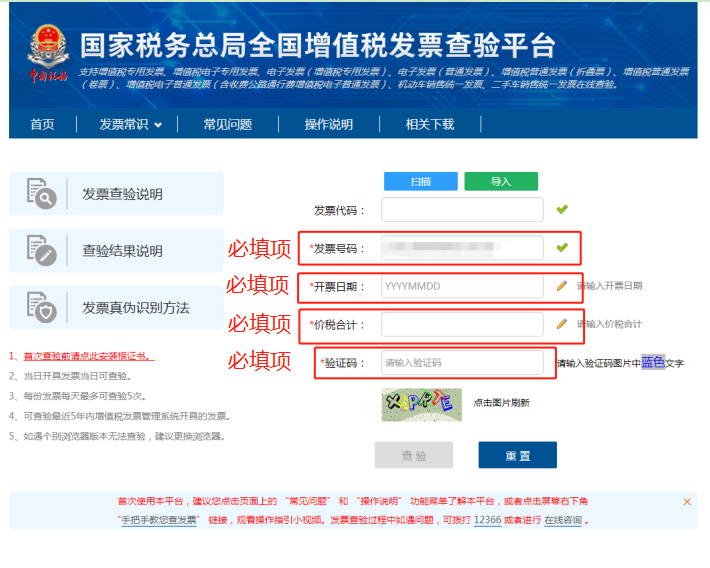 第三步:在紅框處輸入對應發(fā)票信息,點擊“查驗”即可。