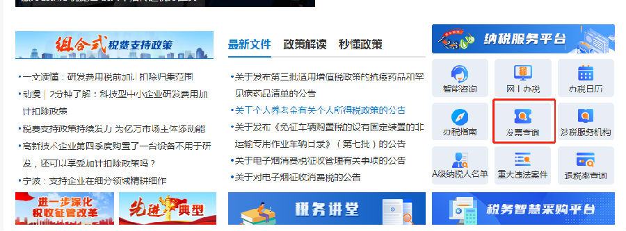 第二步:首頁向下滑動,找到“納稅服務平臺”模塊,點擊“發(fā)票查詢”進入國家稅務總局全國增值稅發(fā)票查驗平臺。